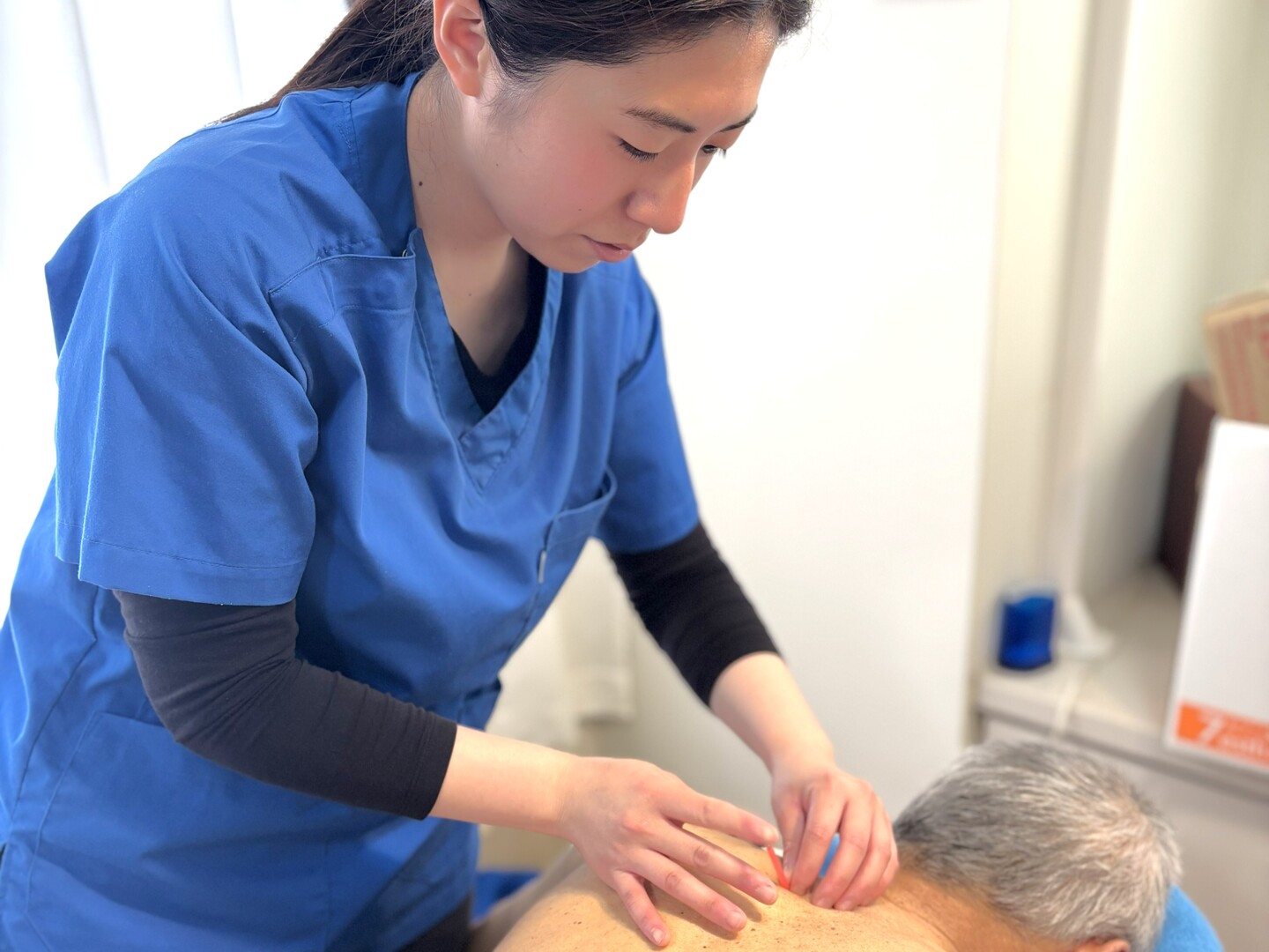 座位にて頸部周囲の鍼灸施術